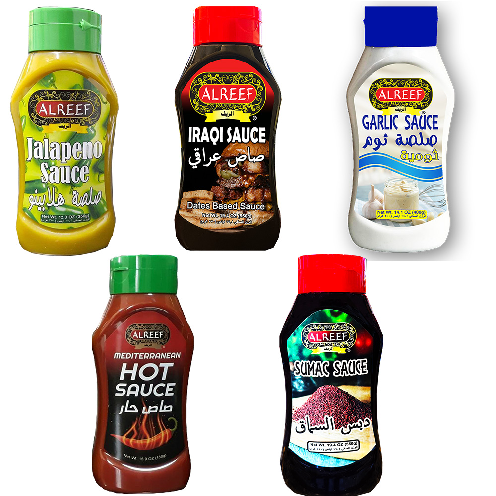 Garlic Sauce 400g, Hot Sauce Squeeze 450g, Iraqi Sauce 400g, Jalapeno Sauce 350g, Sumac Sauce 550g
